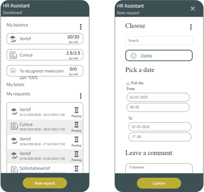 Ook afwezigheid wegens ziekte kan in de HR Assistant ingegeven worden. Bij het indienen van de aanvraag kan bovendien het nodige attest meegestuurd worden. Zo kan de verantwoordelijke de documenten raadplegen en de afwezigheid goedkeuren.